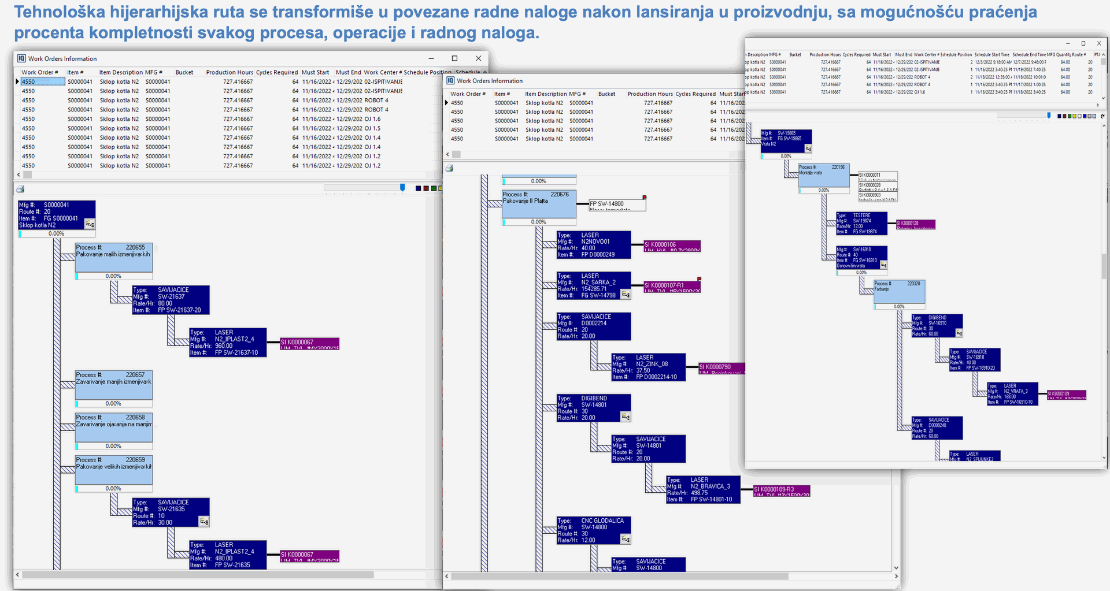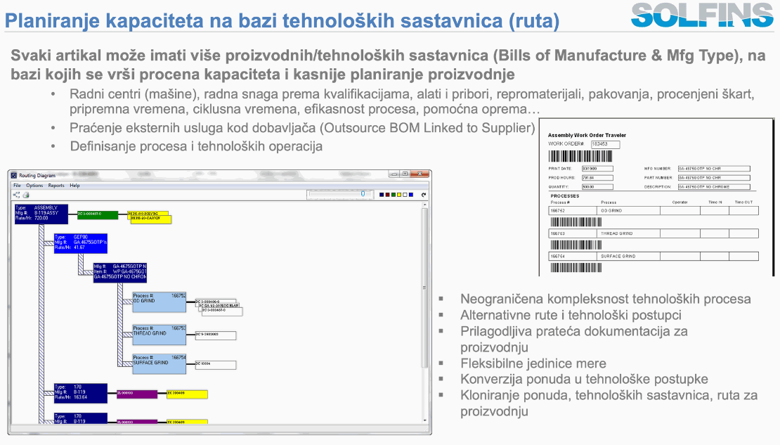 Isti princip se primenjuje i za radnu snagu kroz Labor Capacity i Labor Whiteboard, gde se zahtevi za operaterima po nivou veštine izvlače iz BOM operacija, pa se planiranje ljudi vrši na osnovu realnih standarda, a ne grube procene. Na ovaj način BOM postaje centralna veza između planiranja materijala (MRP), planiranja kapaciteta mašina i planiranja ljudskih resursa, jer se svi gledaju kroz istu, konzistentnu tehnološku sliku proizvoda.