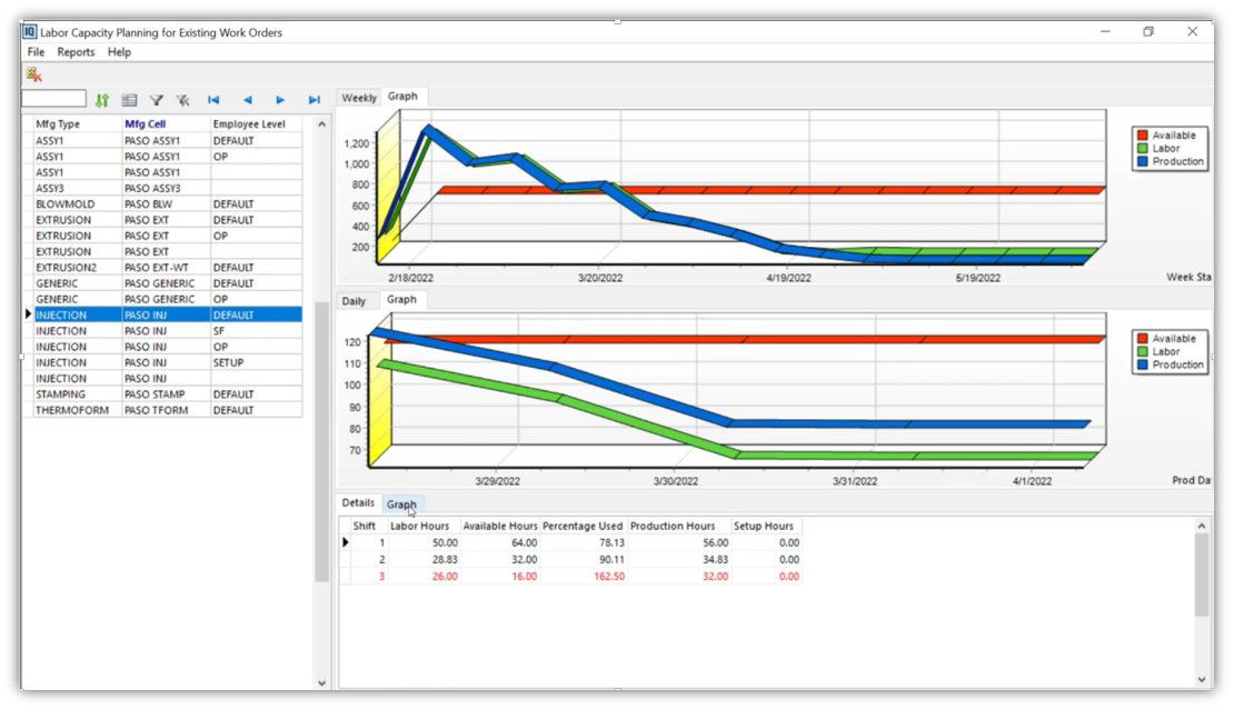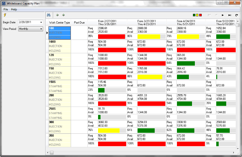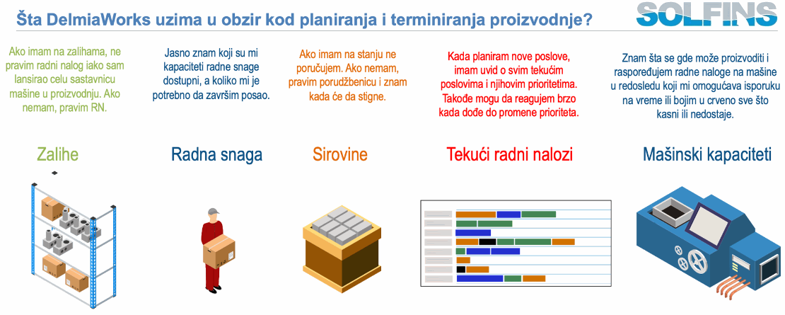 U MRP/Capacity Planning analizi DELMIAWorks poredi te „required hours“ iz BOM‑a sa raspoloživim kapacitetom iz Shop Calendar‑a (radni dani, smene, odmori) i standardnog kapaciteta po mašini i po tipu resursa. Ako posao ne može da se odradi u traženom vremenskom periodu zbog ograničenja kapaciteta, sistem precizno računa prvi slobodan termin kada radni centar može završiti traženu količinu, što je moguće samo zato što BOM sadrži realne norme vremena i rute. Na Capacity Whiteboard‑u planer zatim vidi po danima, nedeljama ili mesecima koliko je koji tip mašina opterećen (zelena, žuta, crvena zona), a iza svakog sata stoji upravo zbir standarda iz BOM‑ova planiranih naloga.