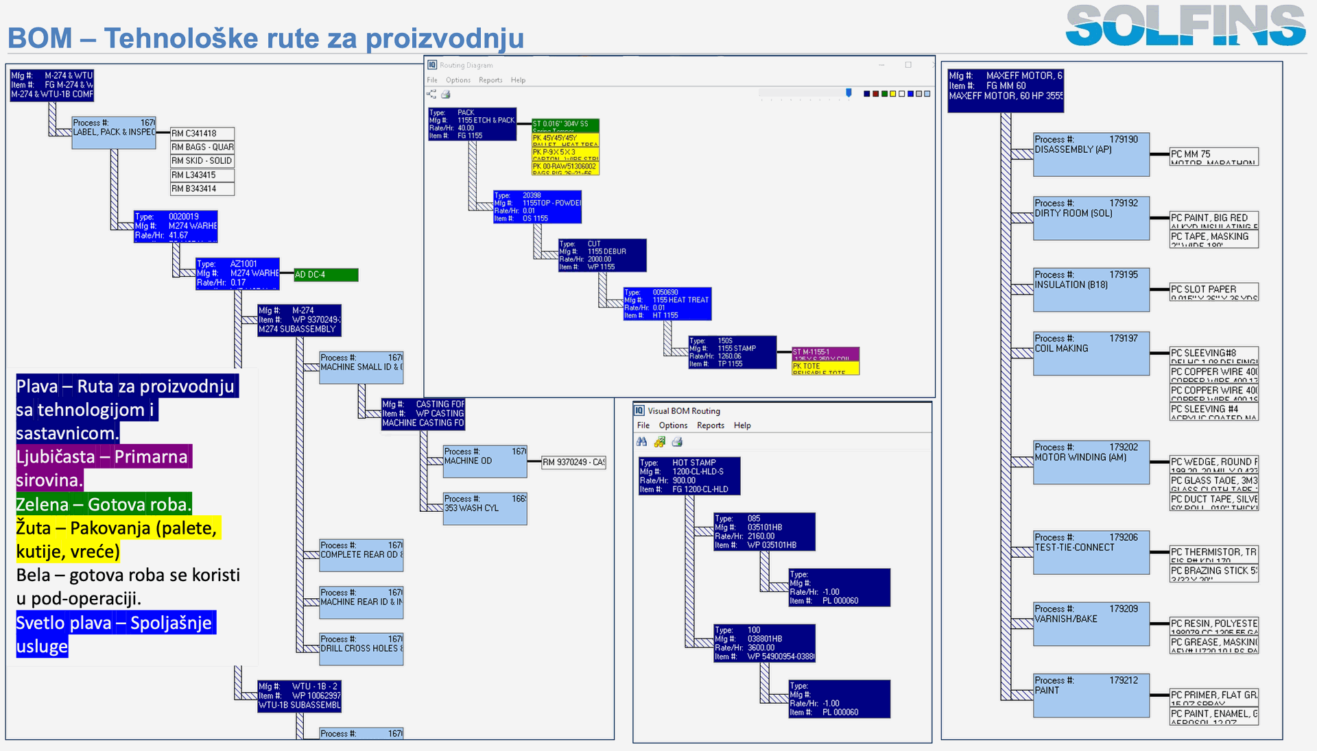 Iz ugla implementacije, posebno u projektima koje vodi tim poput Solfins‑a, BOM (Bill of Manufacture) je jedan od najkritičnijih i najosetljivijih delova projekta, jer spaja inženjering, tehnologiju, proizvodnju, planiranje, kvalitet i finansije. Tipičan izazov je kako prevesti postojeće inženjerske BOM‑ove (EBOM) iz CAD/PLM sistema u proizvodne BOM‑ove (MBOM) koji imaju smislen Manufacturing Type, rutu, operacije, radne centre, alate i norme, a da pri tom ne izgubimo vezu sa konstrukcionim izmenama i verzijama.