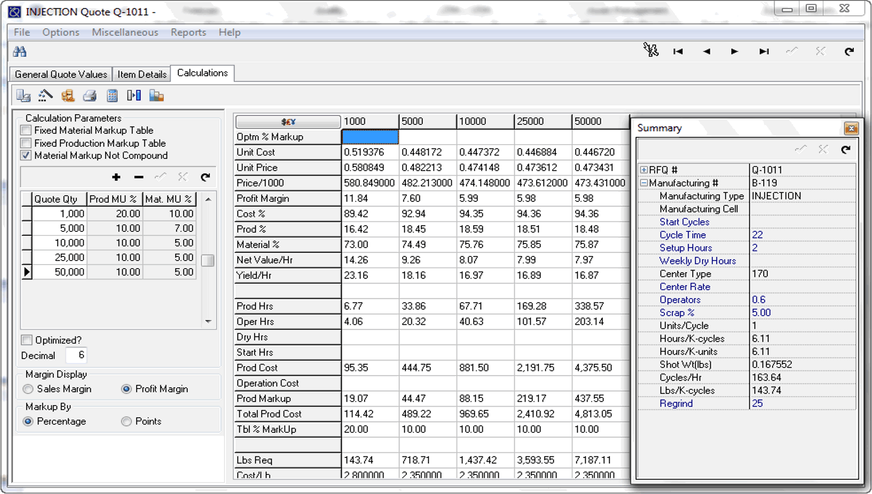 Estimating & Quoting omogućava da se jedna ponuda sagleda iz više uglova. Za isti artikal mogu se definisati različiti scenariji po serijskoj veličini, različitim mašinama ili alatima i različitim cijenama materijala. Modul podržava neograničene price break nivoe (različite cene po količinskim pragovima), fleksibilne mark‑up stope po artiklu, kupcu ili čak po varijanti routinga, kao i “what if” scenarije gde se na licu mesta menja marža i odmah vidi uticaj na krajnju cenu i profitabilnost. Ovo je posebno korisno tam gde radite sa OEM kupcima koji traže cene za 1k, 10k, 50k komada, sa različitim očekivanjima oko politike popusta.