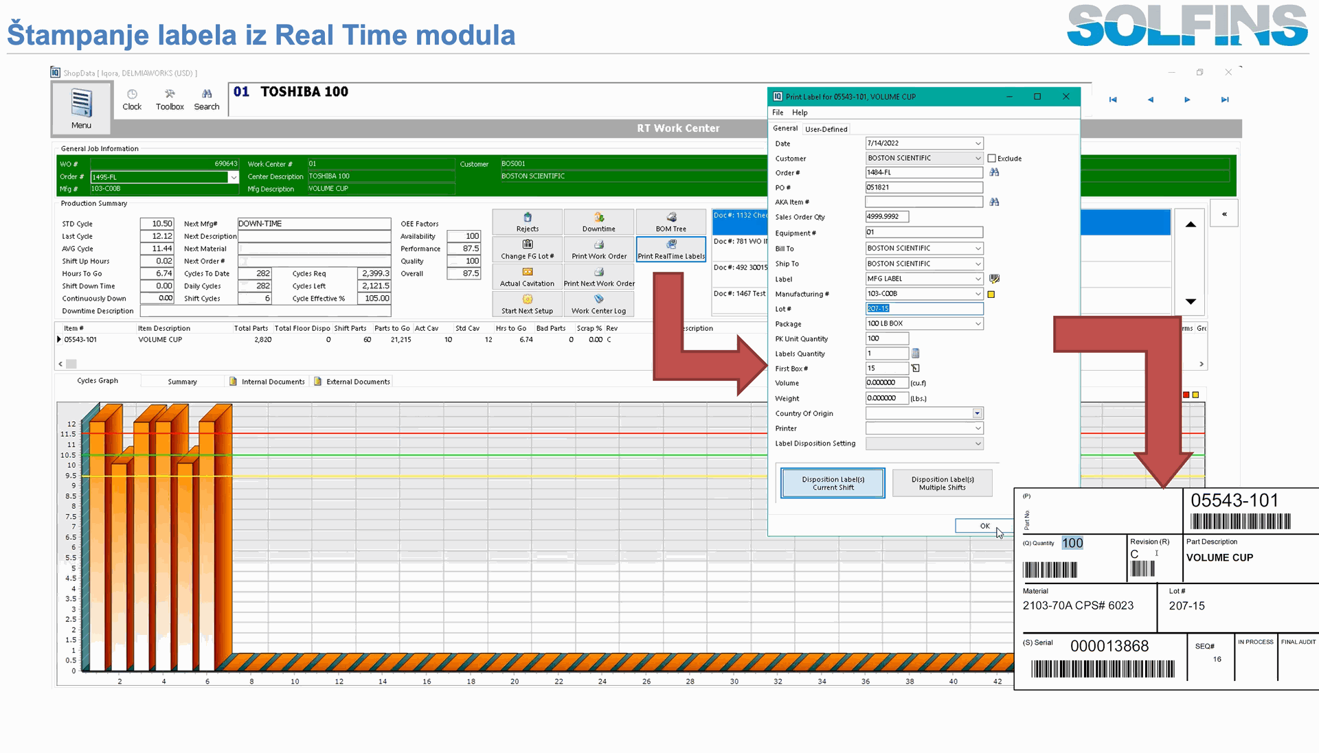Ključni korak u kontrolisanju proizvodnje je „Floor Disposition“ – trenutak kada se proizvedeni delovi sa radnog naloga formalno prebacuju u zalihu, uz paralelno razduživanje sirovina. U standardnom scenariju, RealTime ciklusi pune proizvodni izveštaj (production report), a Floor Disposition određuje koliko komada ulazi u koju lokaciju, sa kojim lotom i serijskim brojem, uz automatski backflush sirovina prema BOM‑u i parametrima u Production Reporting modulu. Ako se koristi RT Scan to Inventory, operater praktično samo skenira serial broj sa etikete, a sistem zna koji radni nalog, koja stavka i koji „floor dispo“ stoje iza tog serijskog broja i automatski odrađuje transakcije u zalihama.