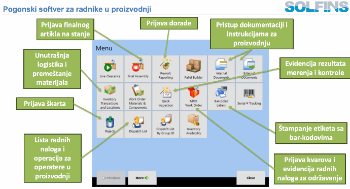 Na ovaj način, Serialized Label Printing, Lot & Serial Tracking, Substitute BOMs, Material Allocation, Variance Reporting, Utilization/OEE i Operator Log In/Out nisu izolovane funkcije, već slagalice koje dopunjuju Production control and reporting sliku: od ciklusa na mašini i logovanja čoveka, preko serijskog broja kutije, do analize varijansi i OEE po ćeliji.