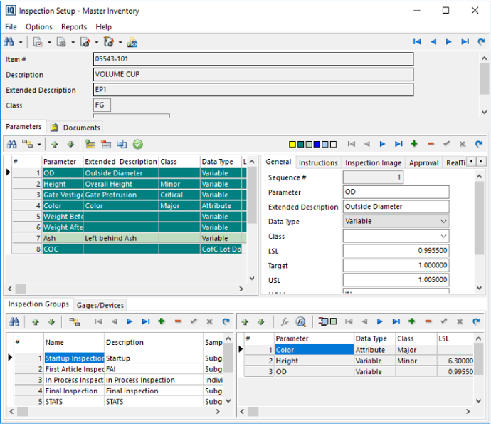 Inspection Groups služe za operativne inspekcije: Quick Inspection za ručni unos uz gage‑eve ili In‑Process log za praćenje bez statistike, a mogu biti vezane za artikle, procese ili radne centre, sa podgrupama ili individualnim uzorcima i definisanom frekvencijom/obaveznošću. Grupa može biti First/Last Case, Work Order Required ili Tool Mandatory, što vezuje SPC sa realnim poslom, alatom i rasporedom.