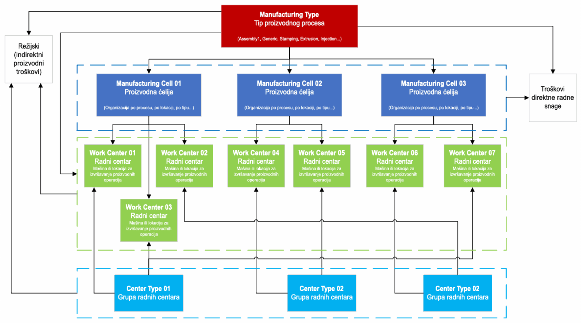 Kada se sve poveže, odnos izgleda ovako: artikl ima jedan ili više Manufacturing Configuration zapisa, svaki od njih koristi određeni Manufacturing Type i BOM sa operacijama; svaka operacija poziva Center Type, a Center Type je povezan sa više Work Center‑a, grupisanih po potrebi u Manufacturing Cells. Work Order za taj artikl povlači iz konfiguracije i materijalne potrebe i rutu sa Center Type‑ovima, a planiranje i RealTime taj model prevode na konkretne mašine, ljude i satnice.