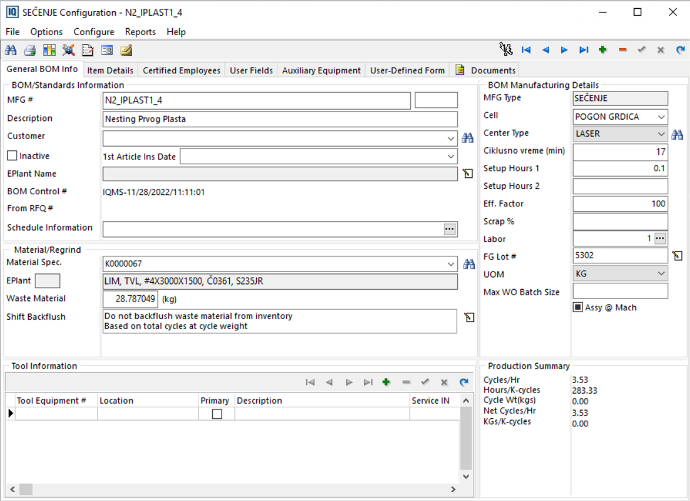 Manufacturing Type opisuje logiku proizvodnje za grupu artikala ili procesa – na primer Injection1/Injection2 za brizganje, Extrusion1/2 za ekstrudere, ASSY1 za linijske montaže po operacijama, Compound1/Masterbatch za mešanje, Generic za specifične slučajeve. Svaki Manufacturing Type definiše kako se čita BOM, u kojim jedinicama se vrši cycle time i potrošnja (komad, težina, dužina), kako se meri scrap i kako se povezuje sa RealTime‑om i Production Reporting‑om.