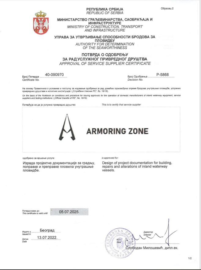 Pored licenciranih inženjera sa licencom 330,  kompanija poseduje i ovlašćenje od strane Ministarstva građevinarstva, saobraćaja i infrastrukture za izradu projektne dokumentacije u brodogradnji.
