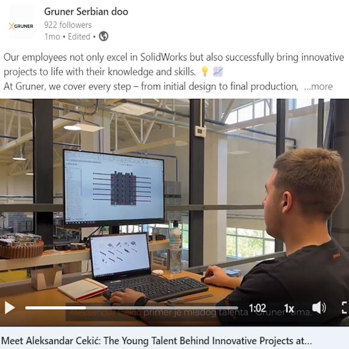 “Gruner Serbian” je mesto gde inovacije i timski rad idu ruku pod ruku. Naši zaposleni odlično poznaju rad u CAD/CAM softveru zahvaljujući kako svom obrazovanju, tako i dodatnim seminarima i obukama koje kompanija realizuje u saradnji sa partnerima iz “Solfins” kompanije.