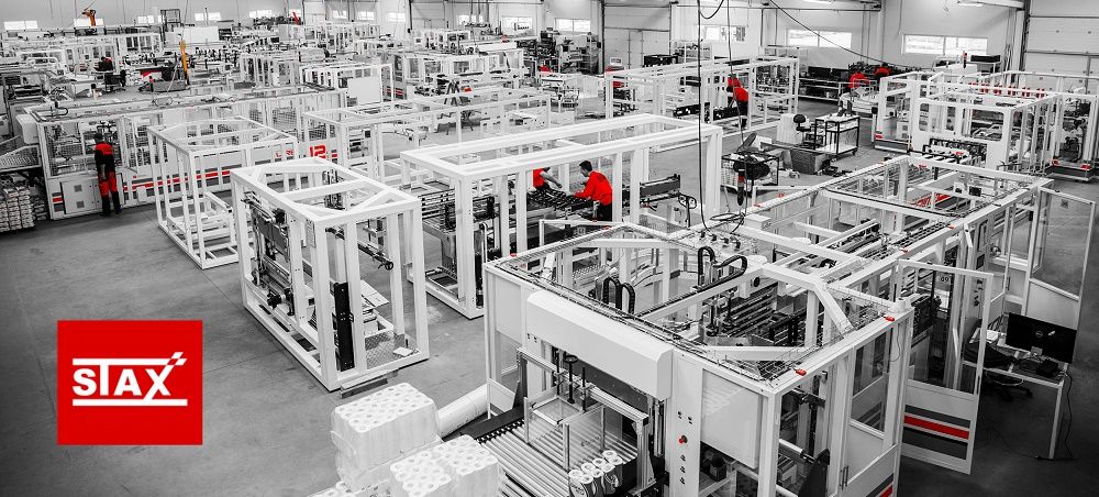 Proizvodnja mašina i sistema za transport i pakovanje salveta, maramica, rolnica.. Stax Technologies je jedan od najvećih proizvođača mašina u Srbiji.