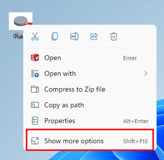 U Windows 11 okruženju kliknuti na bilo koji SolidWorks fajl i ići desni klik. Nakon toga ići na opciju "Show more options". Nakon otvaranja dodatnih opcija, u padajućem meniju bi trebalo biti vidljivo polje SolidWorks, kao na slici.