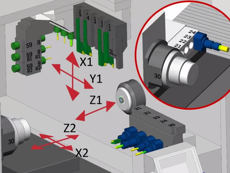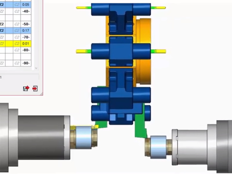 Ovde naročito dolazi do izražaja moćan softver poput SolidCAM Swiss-Type modula koji omogućava da napravite takav raspored alata, gde će softver da sinhronizuje korišćenje revolvera tako da obavlja istovremeno dve operacije za istovremenu obradu zadnjeg dela jednog komada i prednjeg dela narednog komada - iako su te dve operacije nezavisno programirane!
