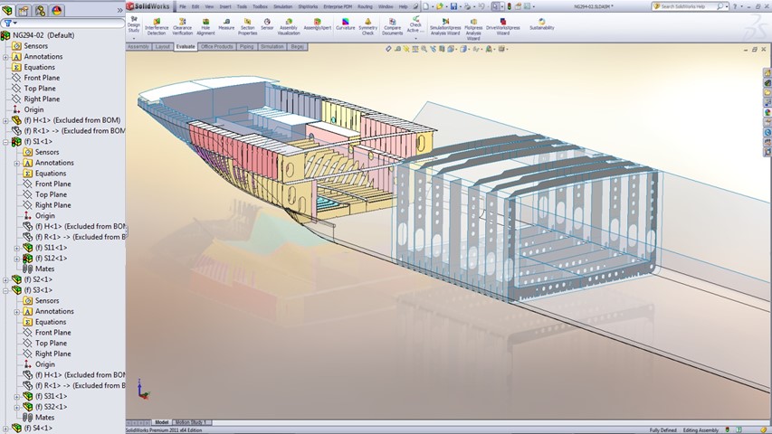Ako pretpostavimo da su površinski modeli konstrukcije svih sekcija gotovi i da je još na samom početku osoba odgovorna za projekat definisala strukturu sekcija i ostalih podsklopova u SolidWorks/Shipworks softveru.