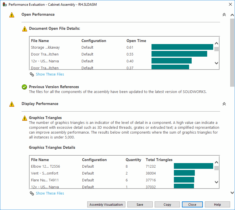 Neretko se dešava da samo jedan deo ili mala grupa delova opterećuju čitav sklop više nego svi ostali delovi zajedno. Razlog je taj što takvi delovi imaju visok nivo detalja. To su najčešće importovane komponente preuzete sa interneta (npr. motor kao kupovna komponenta) Pri analizi već izgrađenog modela, veoma je teško 'golim okom' uočiti koji su delovi problematični, pa iz tog razloga SolidWorks poseduje alate koji će uočiti greške, dati predloge rešenja ili vizualno predstaviti čitav model prema zadatim parametrima