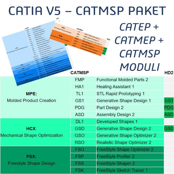 CATIA V5 Mechanical & Shape Engineer Excellence (CATMSP) конфигурацијата ги содржи следниве модули по многу конкурентна цена: