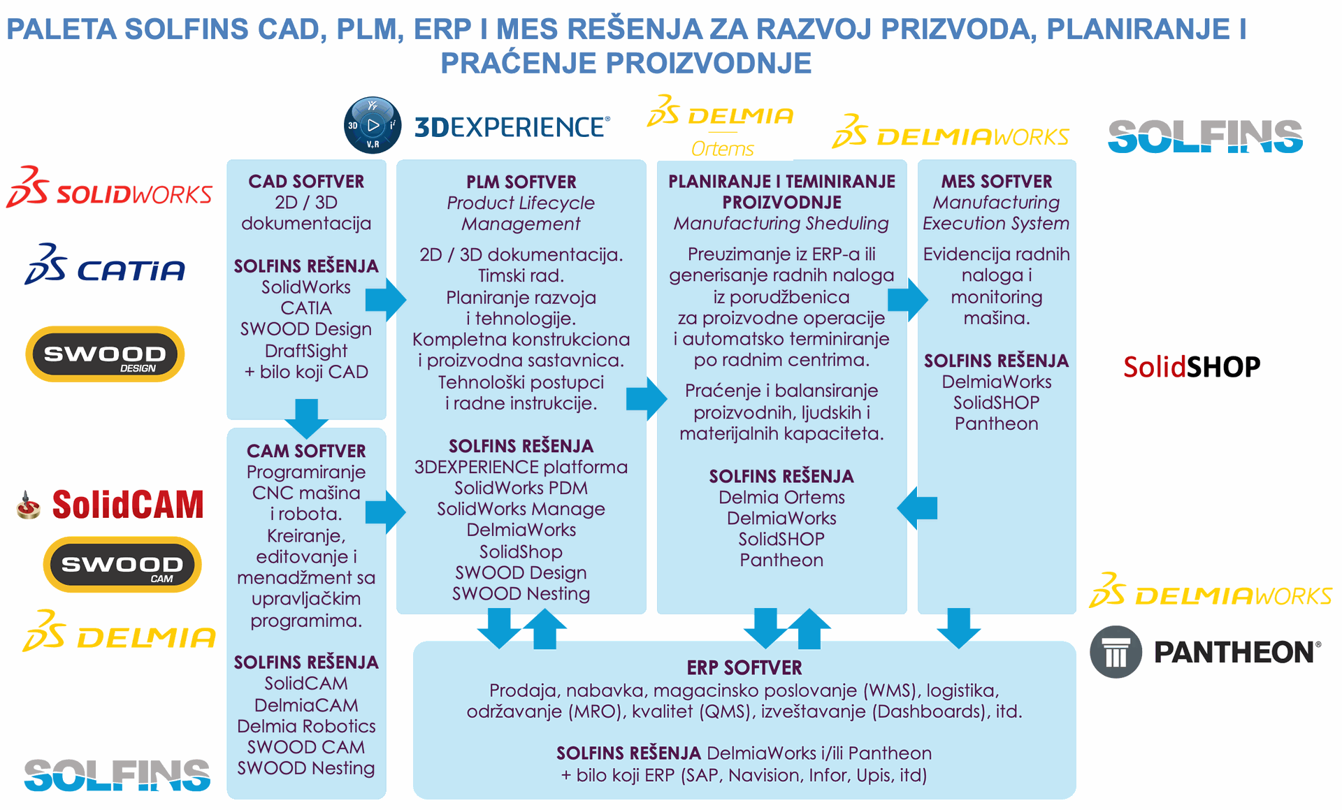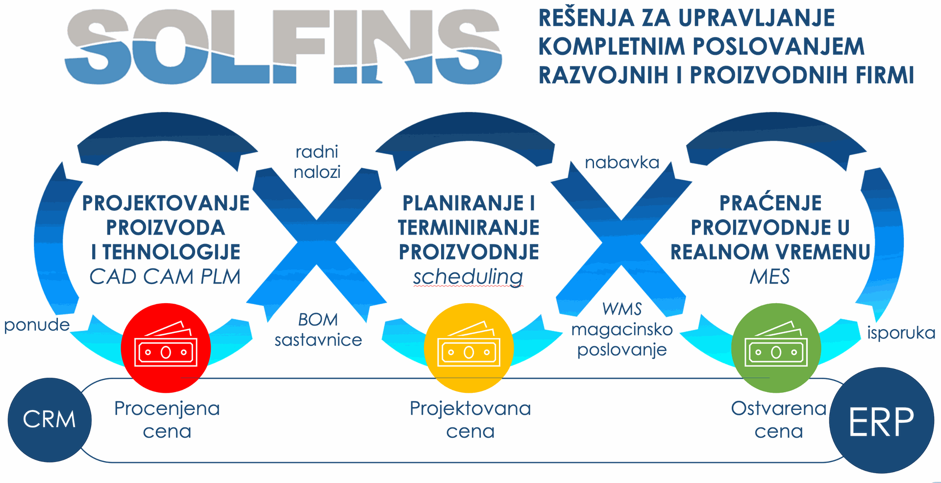 Firma Solfins ima jednstvenu poziciju na tržištu, jer razvojnim i proizvodnim firmama može da pruži konsalting i softverska rešenja od ideje za novi proizvod, kroz njegov razvoj i planiranje razvojnih aktivnosti, izradu tehnologije za proizvodnju do kasnijeg planiranja i praćenja proizvodnje i svih ostalih poslovnih procesa. Rešenja za naše klijente ostvarujemo kroz industrijsko znanje i poznavanje proizvodnih procesa, ali i kroz vrhunske softverske alate.