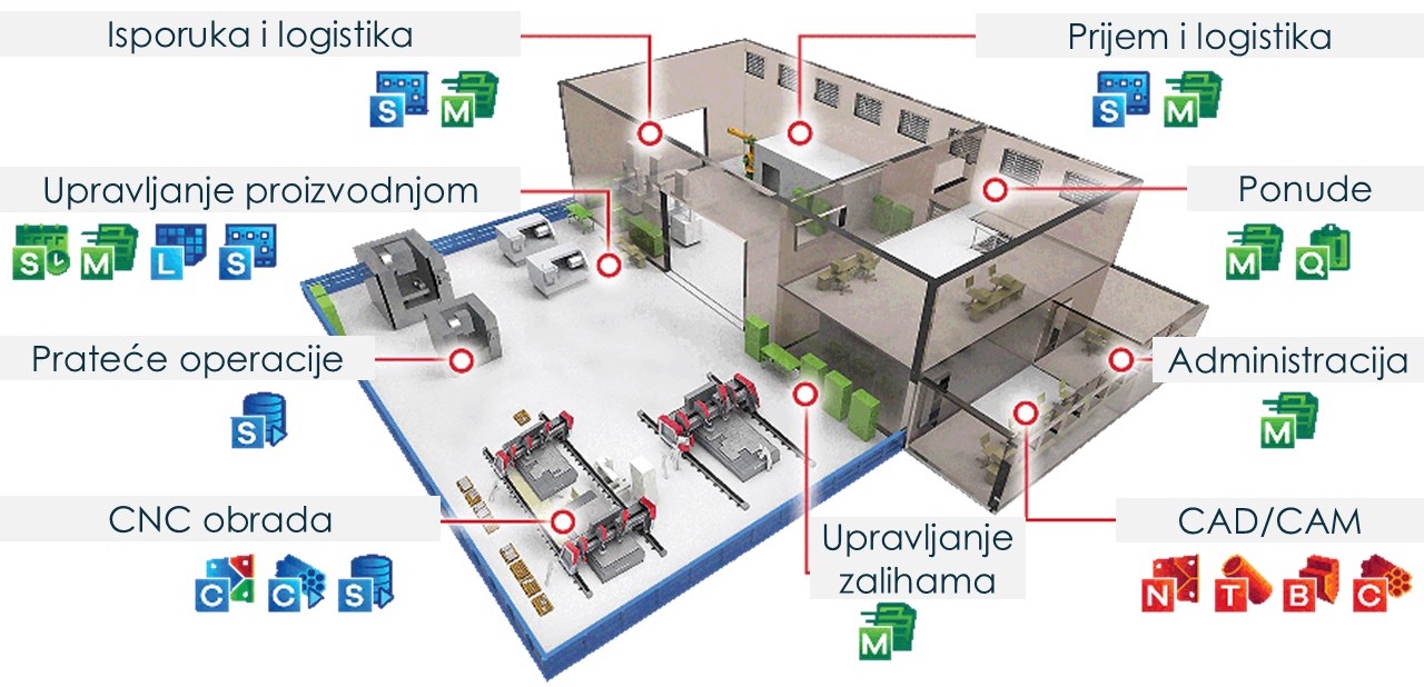 Сеопфатно MRP решение за управување со бизнисот на фирми кои преработуваат лим, заварени конструкции, носечки челични конструкции и воопшто сите индустрии во кои се сечат плочести материјали, профили, цевки, шипки и каде се прават кројни листи и се бара оптимизација на потрошувачката на материјал. Комплетно управување од понуди, нарачки, преку управување со залихи, набавка, програмирање на CNC машини кои се спрегнати во цел систем и од кои се ажурираат информации за статусите на работните налози и потрошувачката на материјал.