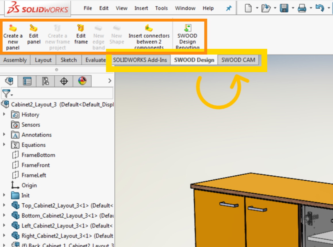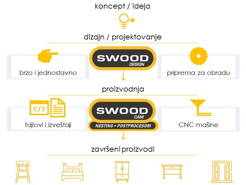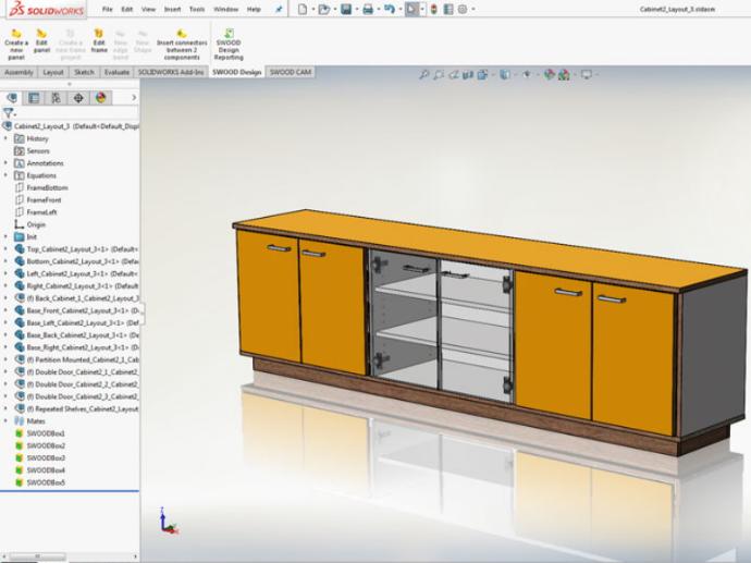 SWOOD поединечни решенија како SWOOD Design или SWOOD CAM се користат директно од SolidWorks интерфејсот и преминот од фаза на дизајн во конструкција и дефинирање на детали, а потоа во програмирање на CNC машини и сечење на плочести материјали, се одвива многу едноставно во неколку табови.